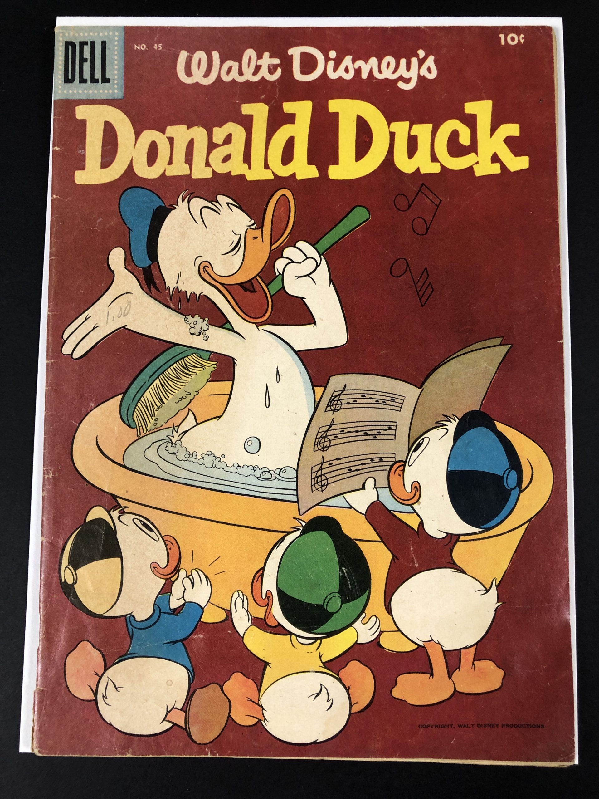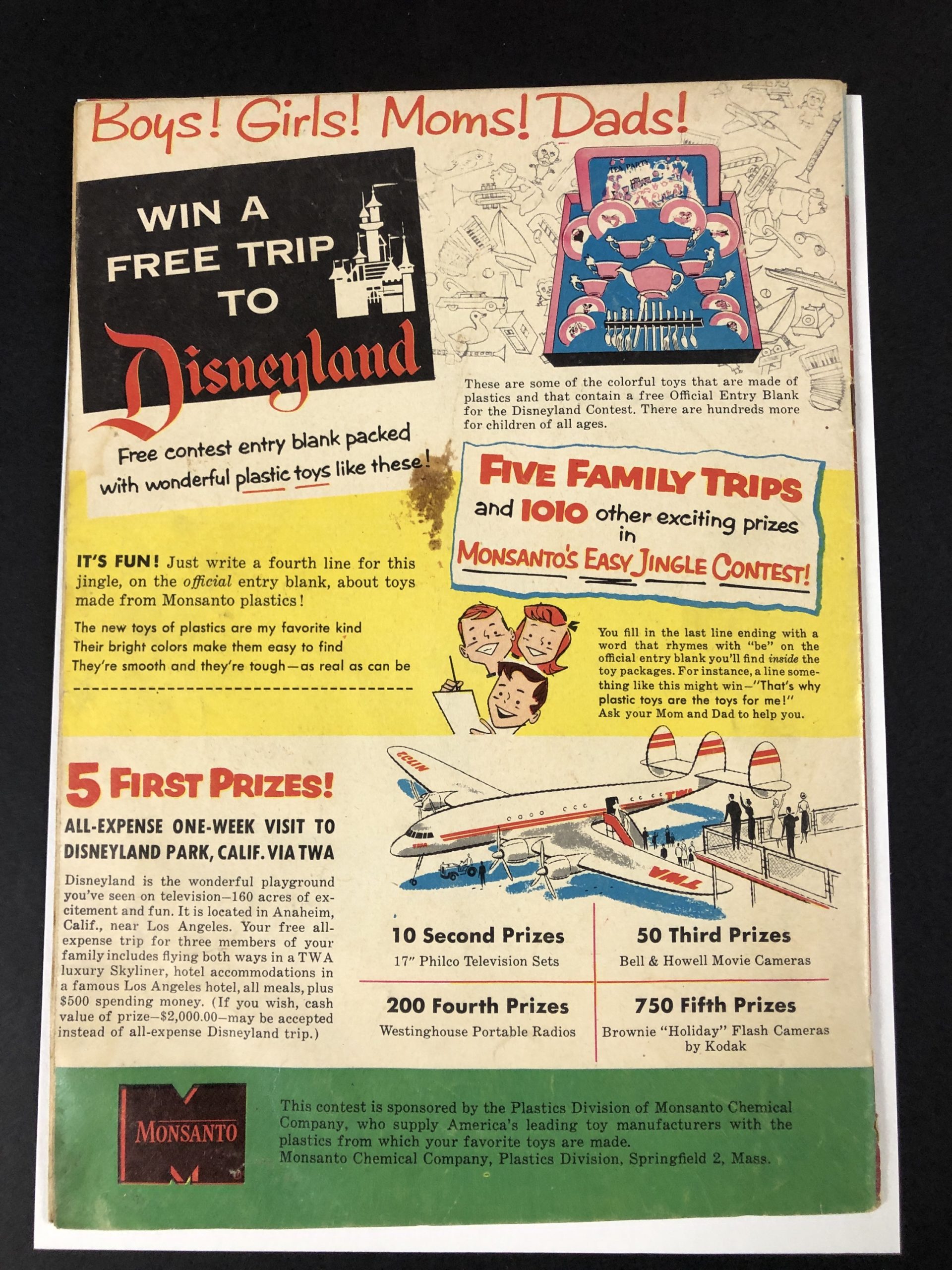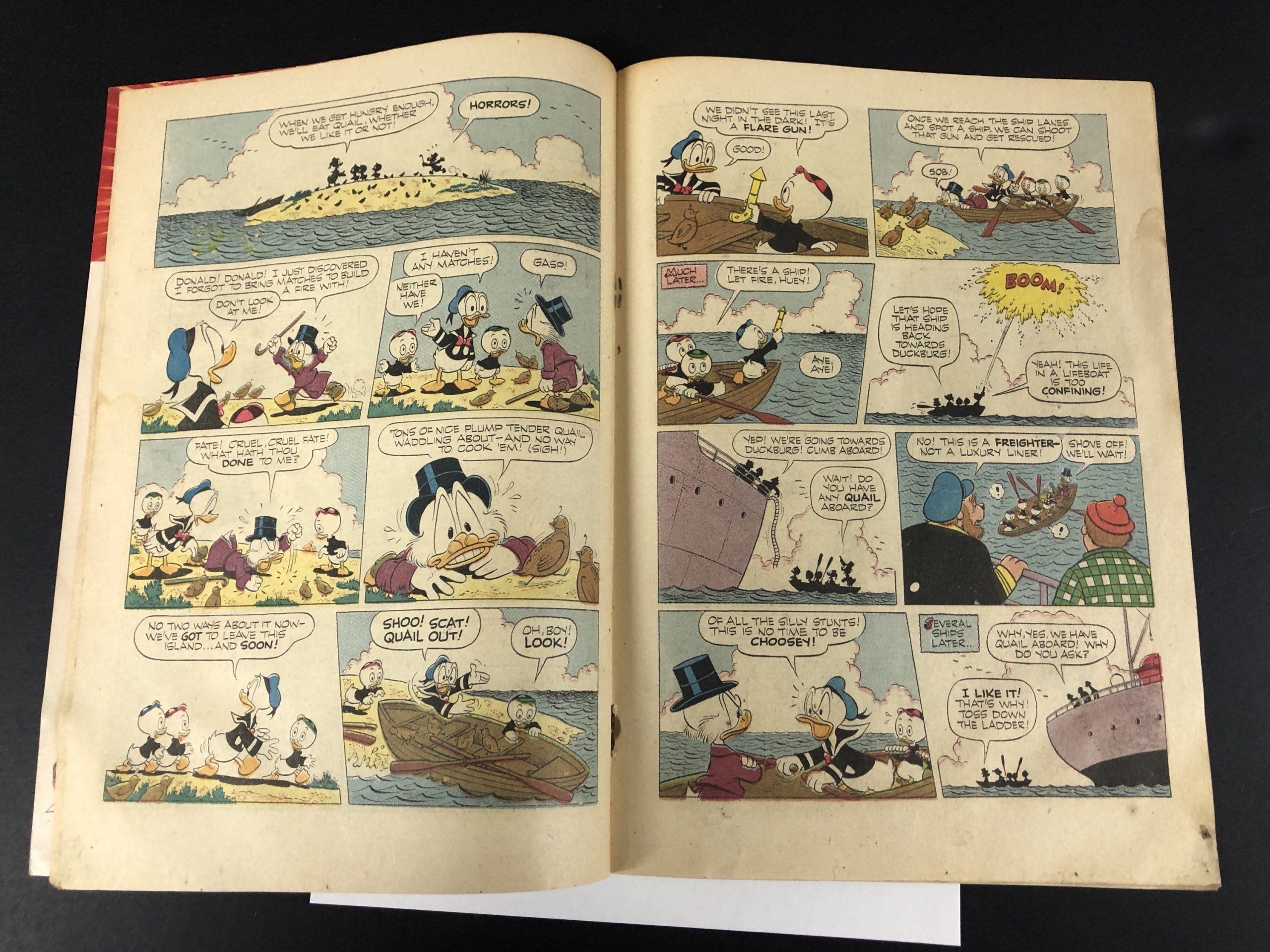 1956, Carl Barks, 1″ spine split, rust on bottom staple, light moisture damage, 2″ interior page tear, 36 pages,