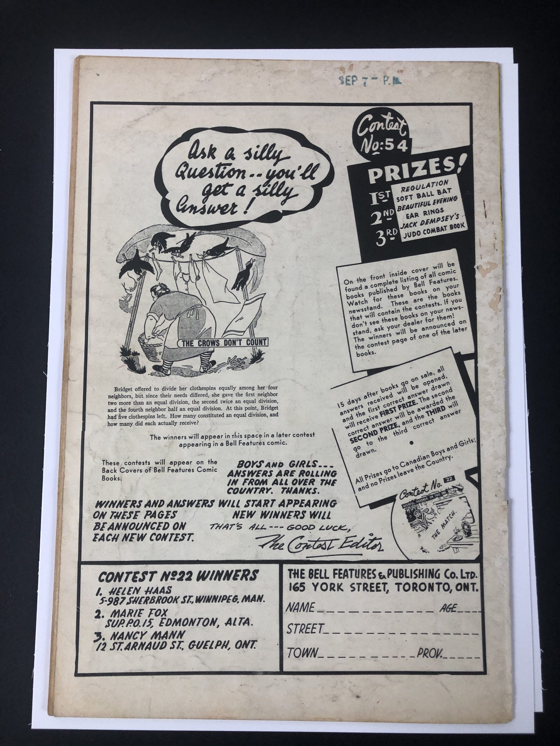1949, Marvel Seal, Canadian Edition, First issue, some rust on staple, 36 pages, Bob Brown, Mike Sekowsky, Vince Alascia, Joe Kubert, Hy Rosen