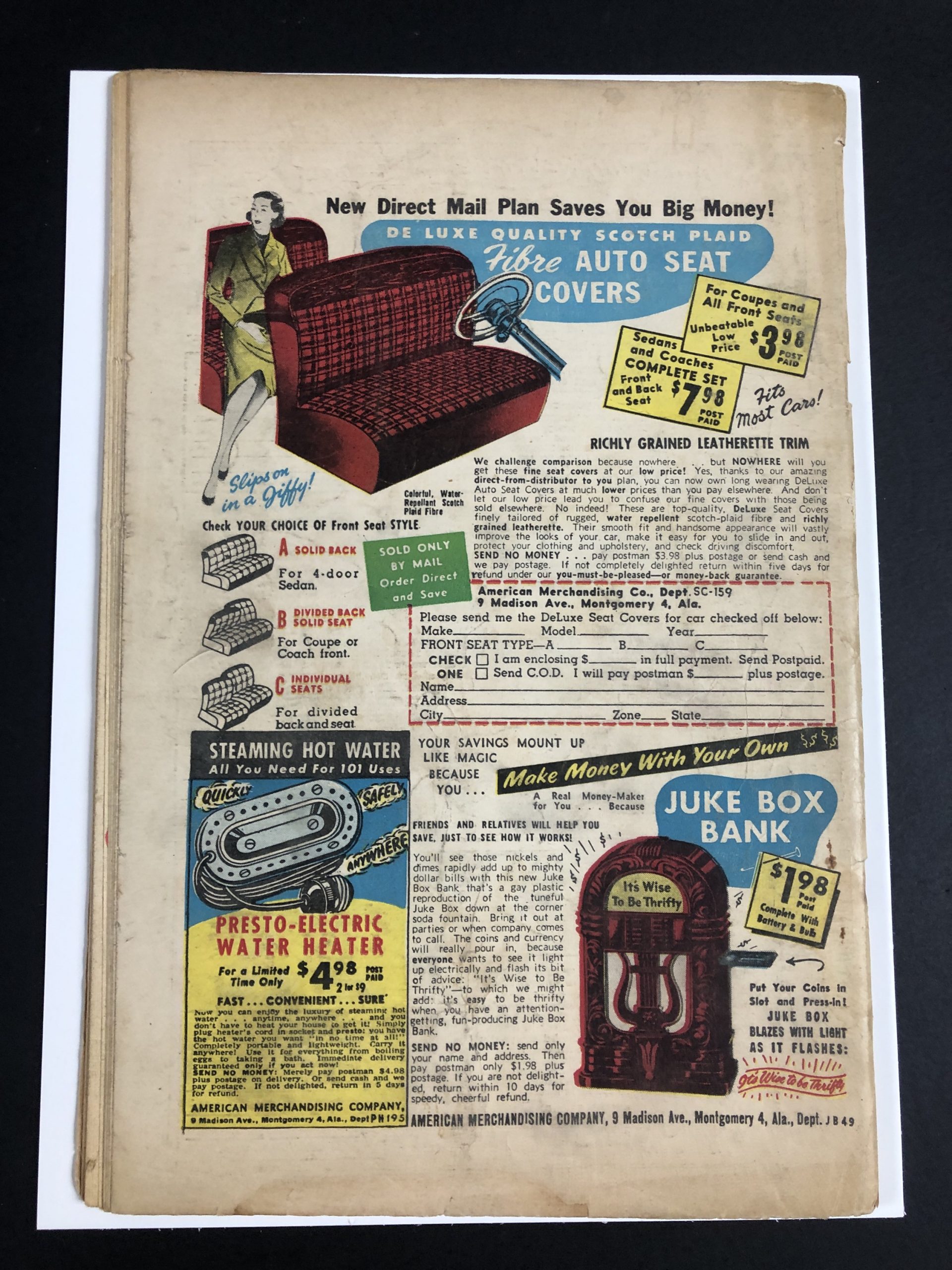 1948, 1/2″ spine split, rusty bottom staple, moisture stain bottom through back of book, 52 pages, Mike Sekowsky, Ken Bald, Al Jaffee, Includes “Hey Look!” strip by Harvey Kurtzman