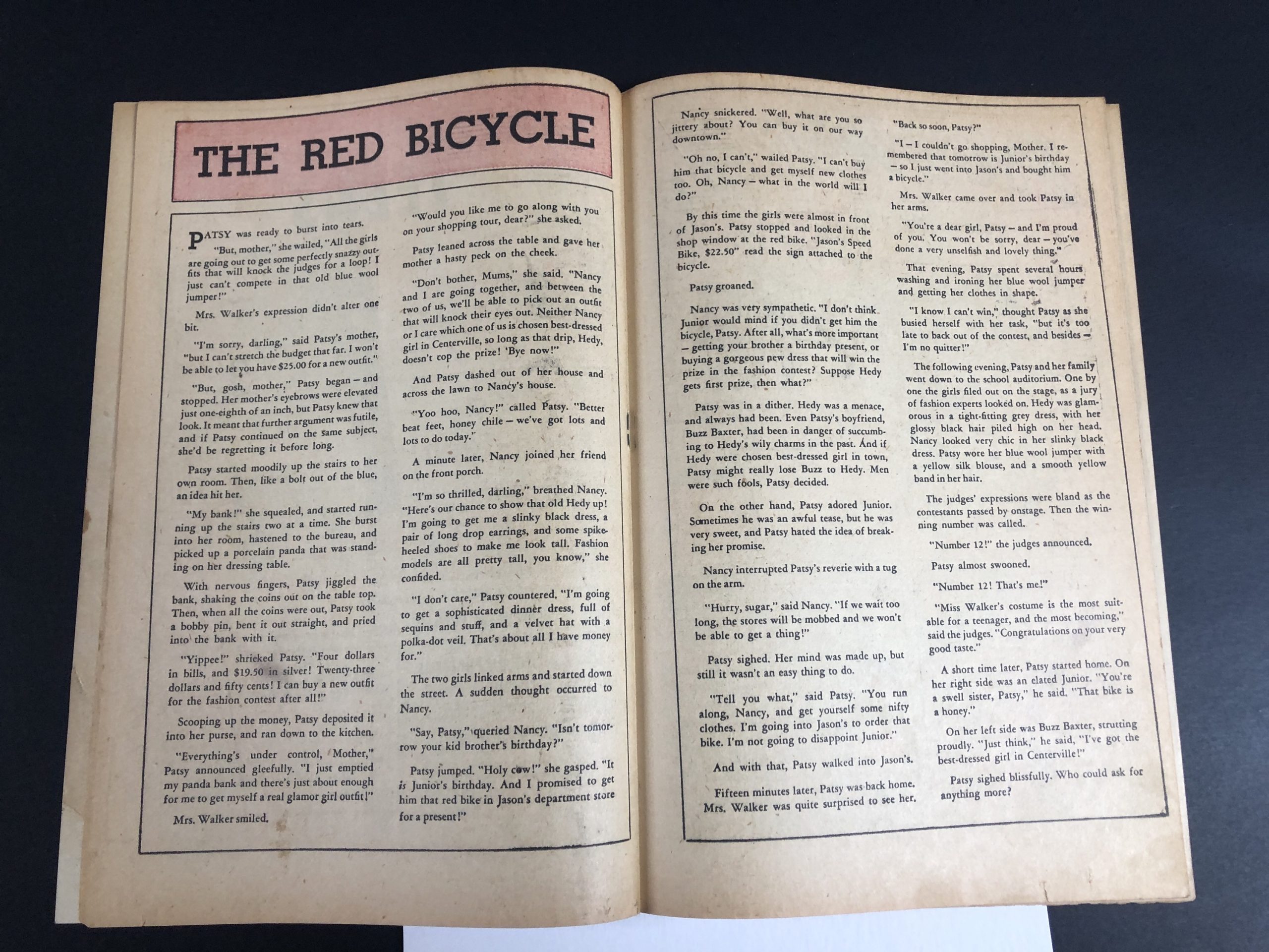 1945, cover loose at single staple, tape inside cover, 1″ tear inside page, 1/4″ stain first 6 pages, 36 pages, equal rights for pay story, Ruth Atkinson