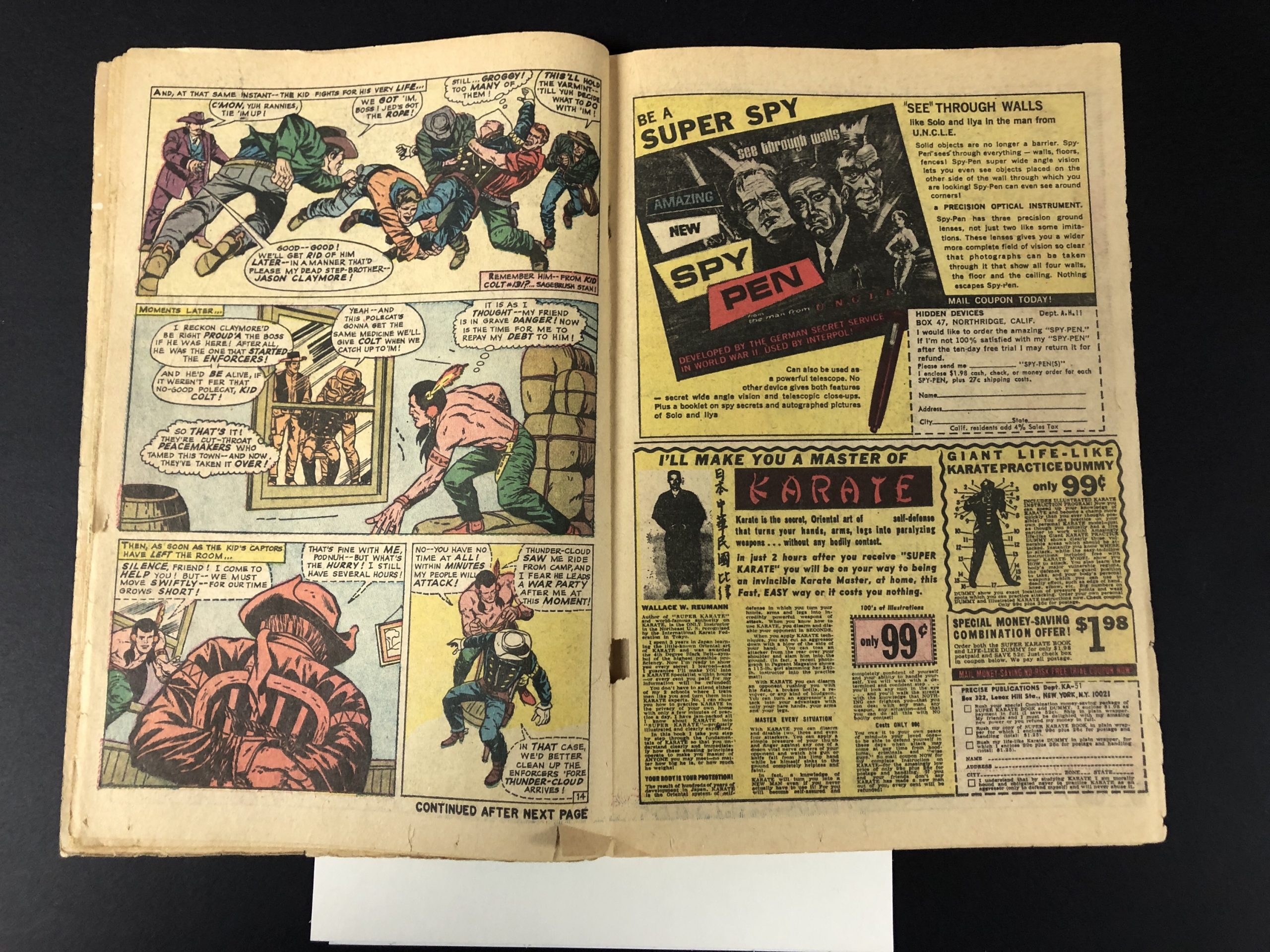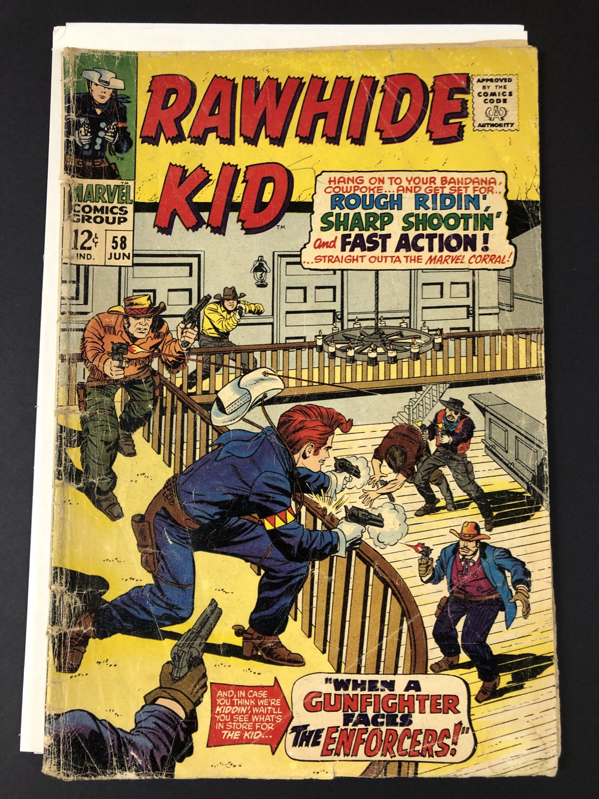 1967, pen & pencil 1st page, centerfold detached at bottom staple, 1/2″ tear interior page, 36 pages, Larry Lieber, Al Hartley, Reprint from Rawhide Kid (1st Series) #32, Vince Colletta