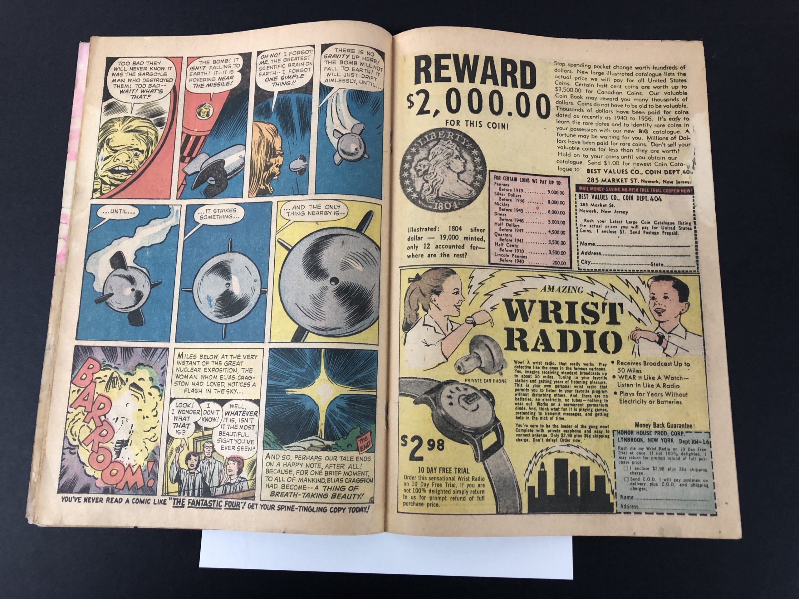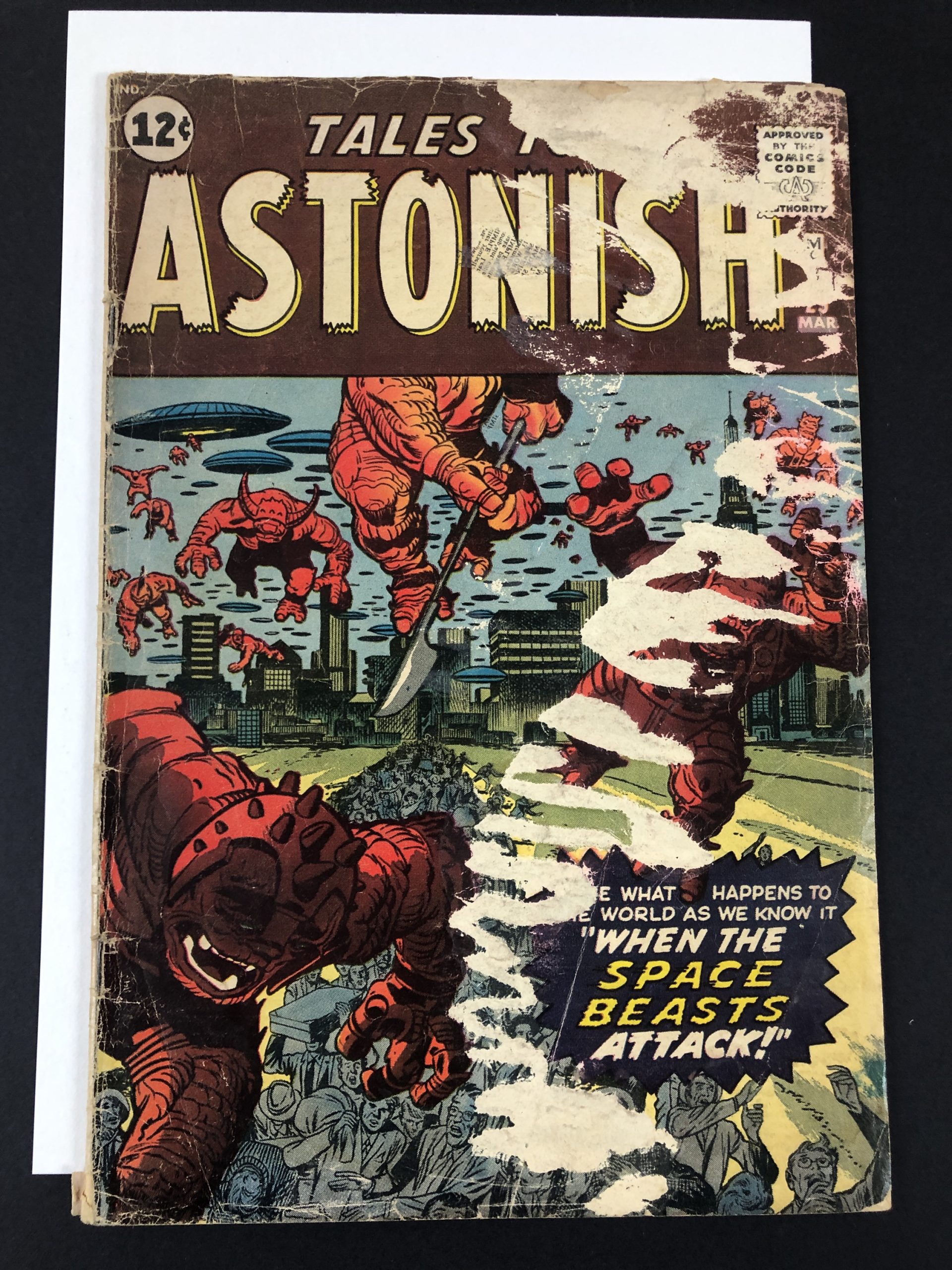 1962, moisture damage, 1/8×2″ tear/stuck from water 2 interior pages, moisture stains first half of books, 36 pages, Jack Kirby, Dick Ayers, Steve Ditko