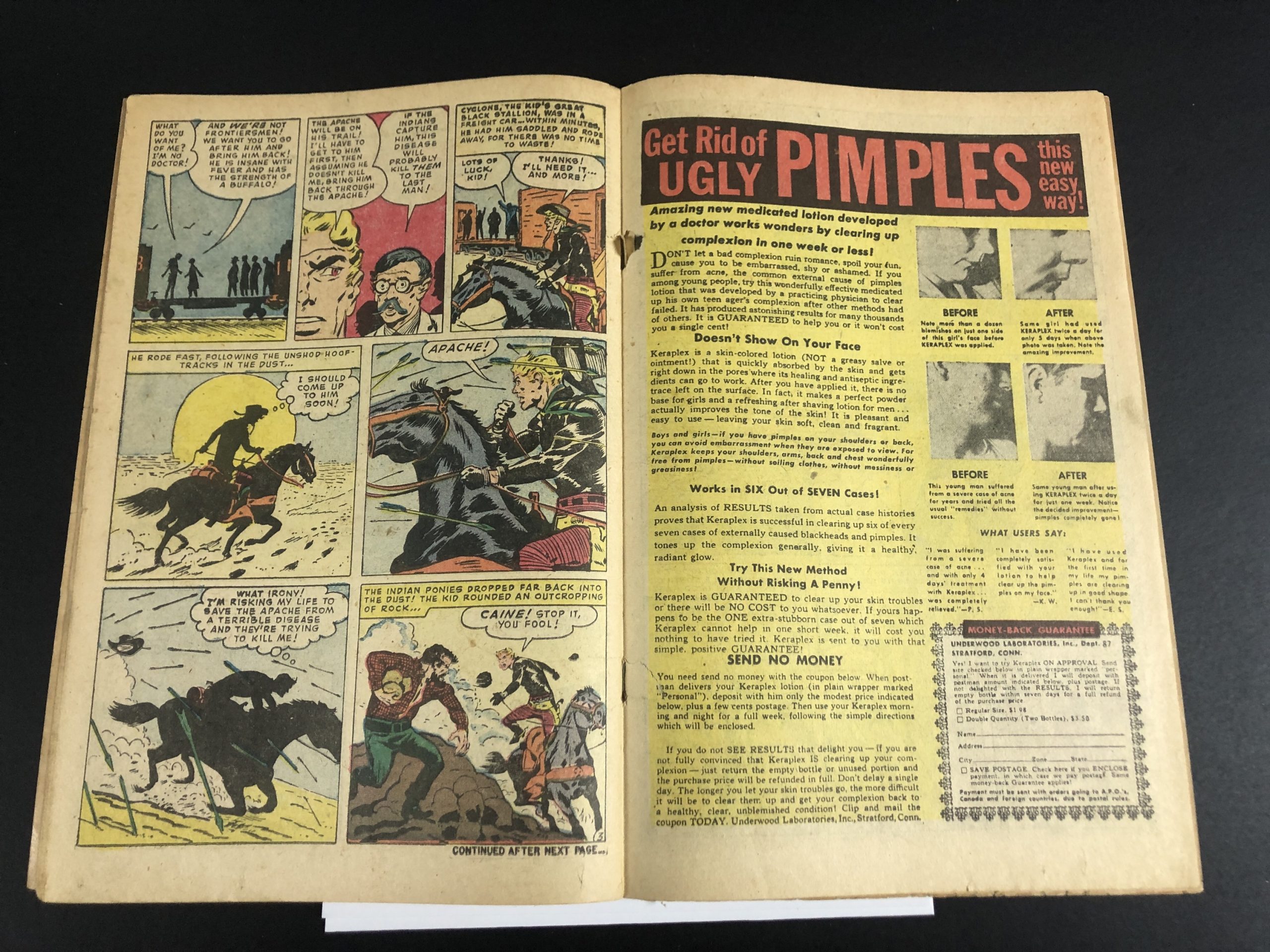 1956, 1″ spine split, store stamp 1st page, 2″ tear 1st page, centerfold torn at top staple, moisture stains, 36 pages, Russ Heath, Chuck Miller, Reed Crandall, Jay Scott Pike