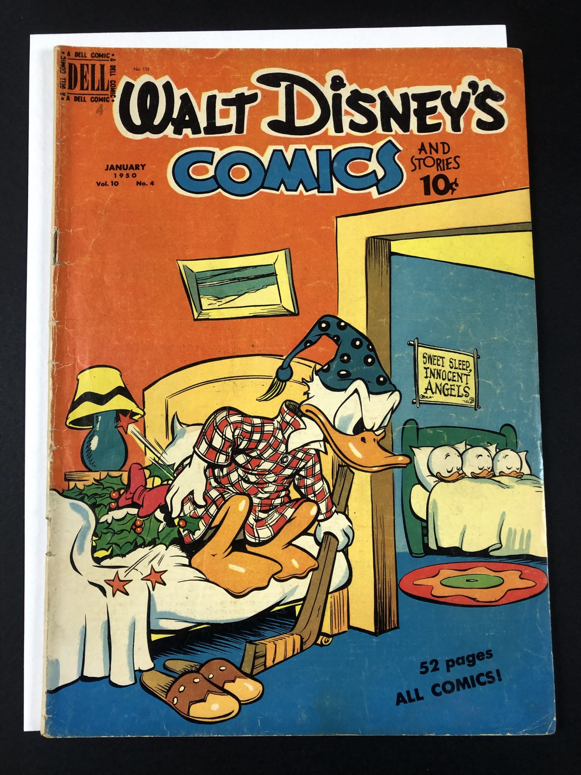 1950, Drug issue, tape at centerfold, tape inside cover, 52 pages, Vol. 10 #4, “Rip Van Donald”, Walt Kelly, Carl Barks, Al Taliaferro, Gil Turner, Floyd Gottfredson, Jack Bradbury, Bill Wright
