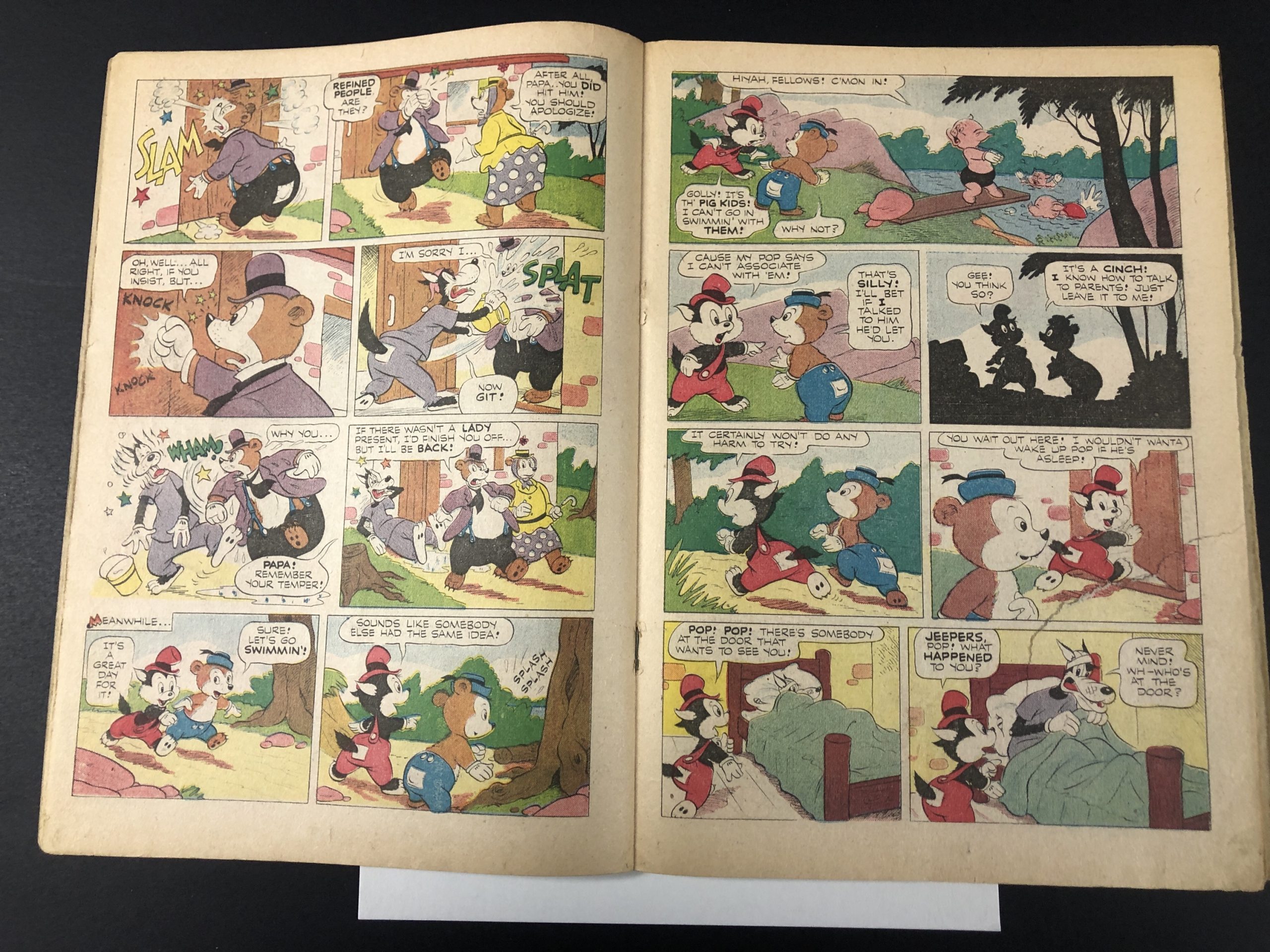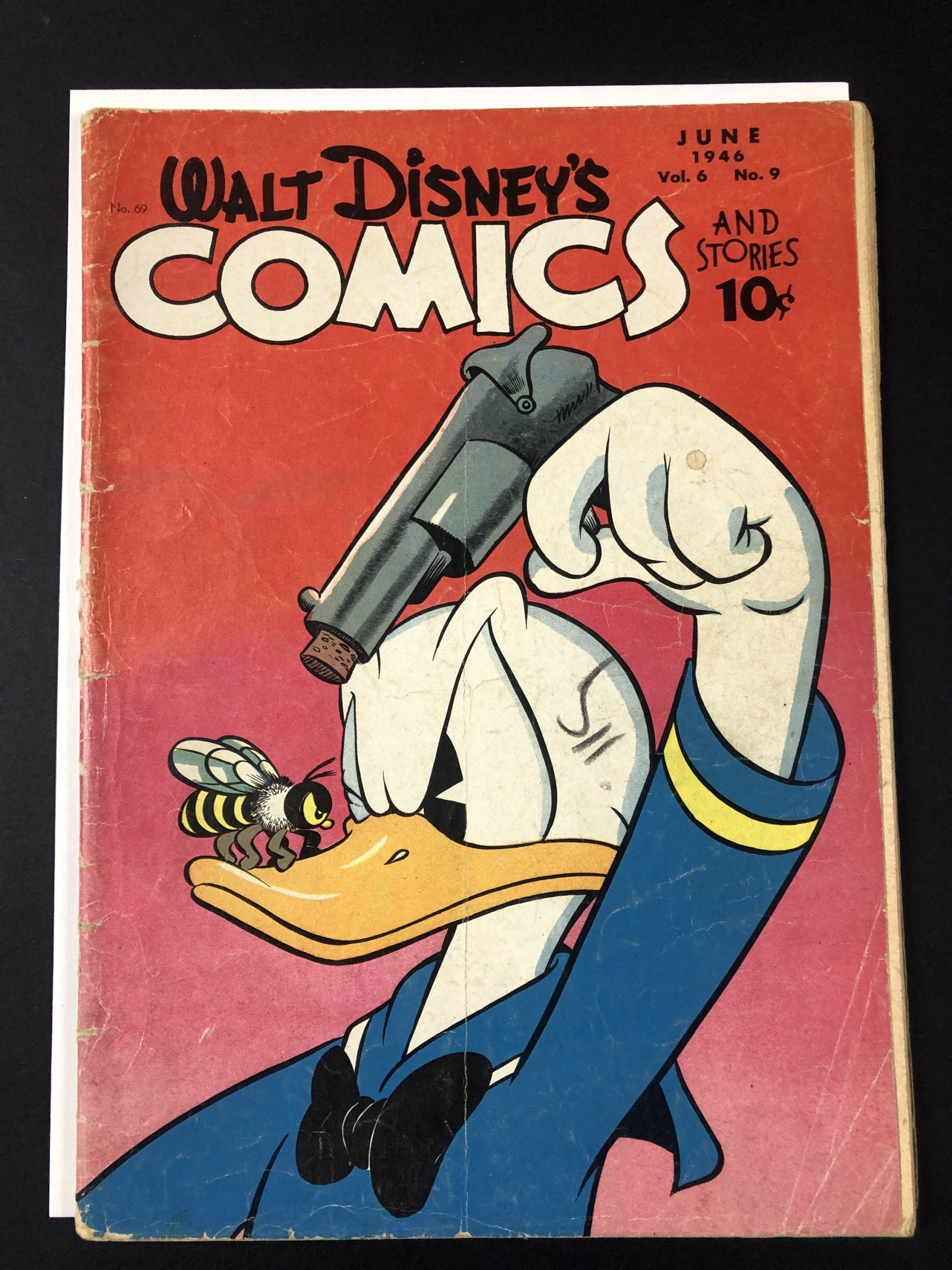 1946, cover detached at bottom staple, cover loose at top staple, centerfold detached at top staple, 3″ tear interior 2 pages, 52 pages, Vol. 6 #9, “BicepsBlues”, Carl Barks