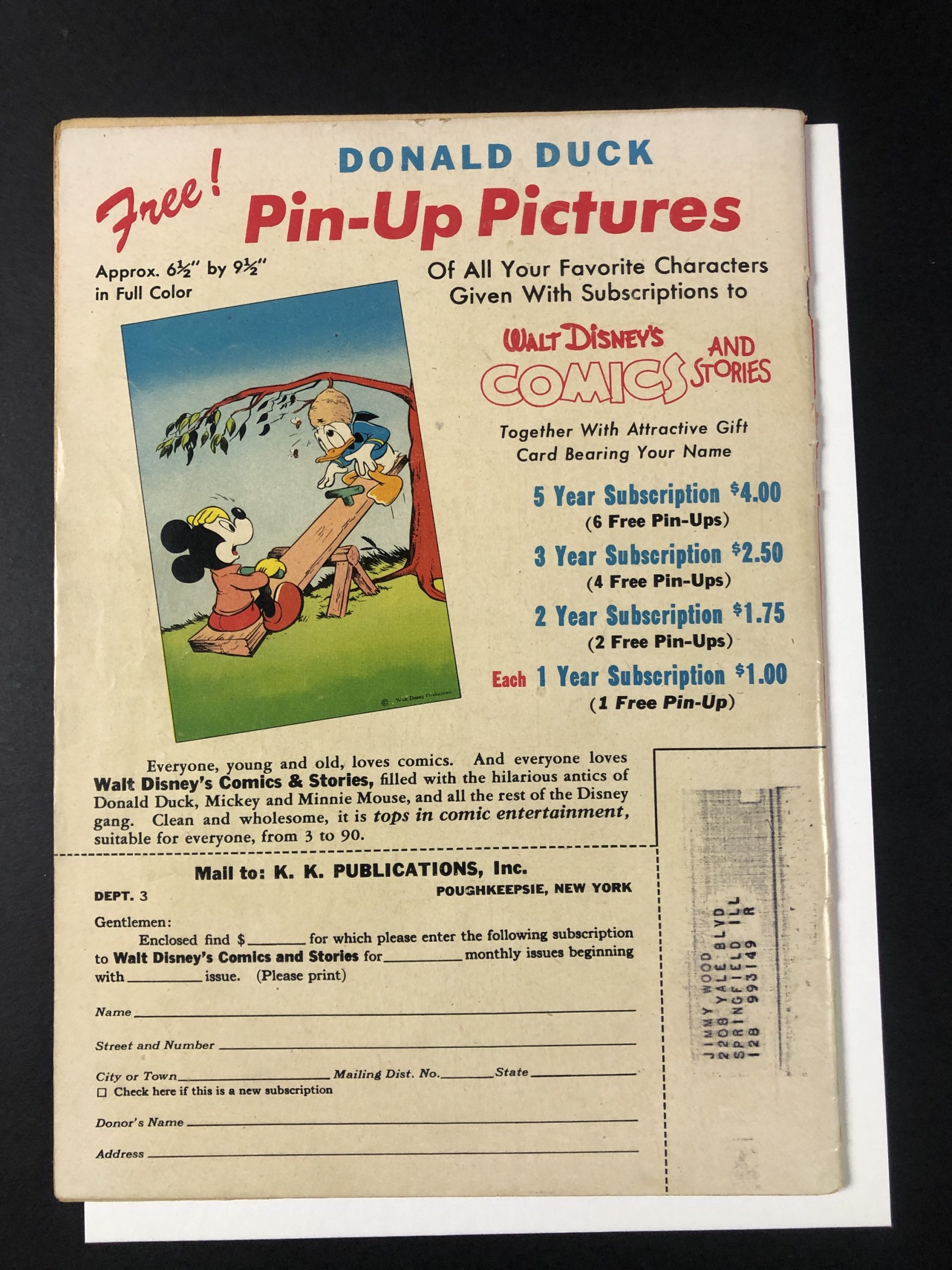 1948, 3″ spine split, cover loose at top staple, letter in pencil 1st page, 1″ piece out of interior page, 52 pages, Vol. 8 #6, “Wired”, Carl Barks, Walt Kelly